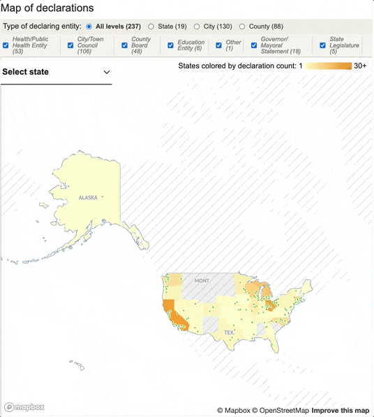 - Racism Declarations Map: our interactive Mapbox map that shows all of the cities and counties in the country that have declared racism as a public health crisis.